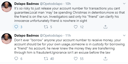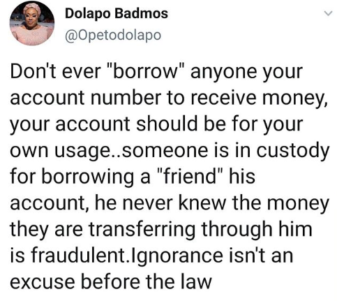 Dolapo Badmus has revealed that a man will likely spend Christmas in prison after he made his account number available for a friend to transfer money, not knowing the money was gotten through fraudulent means. The CSP added that the friend is now on the run and the one who gave his account number for the transaction is left to pay the price. She warned people to desist from "borrowing" their account numbers to people who want to receive money through their account. She tweeted: "Don't ever "borrow" anyone your account number to receive money, your account should be for your own usage..someone is in custody for borrowing a "friend" his account, he never knew the money they are transferring through him is fraudulent.Ignorance isn't an excuse before the law. "It's so risky to just release your account number for transactions you cant guarantee.Local man 'may' be spending Christmas in detention,more so that the friend is on the run. Investigators said only his "friend" can clarify his innocence unfortunately friend is nowhere in sight." She added on Instagram: " It's very risky to just release your account number for transactions you cant guarantee.....Local man 'may' be spending Christmas in detention...more so that the friend is on the run....investigators said only his "friend" can clarify his innocence unfortunately the friend is no where to be found,"