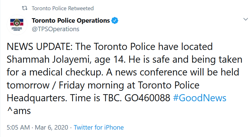 Authorities also discovered the burned remains of a black Jeep Wrangler, similar to the vehicle where the suspects kidnapped the teen on Thursday afternoon. An Amber Alert was issued at midnight, hours after the teen’s father filed a report with the police. Superintendent Steve Watts later said in a press conference that Jolayemi’s step-brother, Olalekan Osikoya, owes money to the suspects involved in the kidnapping. The drug deal at issue is alleged to have taken place in the summer of 2019, Watts said, adding the value of the drugs taken was approximately $4 million. He said the boy's stepbrother is suspected to have fled the Toronto area some time after the drugs were taken. He said officers have since made contact with Osikoya and he is co-operating with investigators.''We believe the teen was abducted as retribution for an unpaid drug debt," Toronto Police Supt. Steve Watts told reporters on Thursday, hours before he was located."Investigators believe the teen's brother owes a large debt in relation to a multi-kilo cocaine rip and has since fled the GTA."The 14-year-old innocent child is not part of that business. He is not a part of that lifestyle. he said Toronto School Board spokesman Ryan Bird said in a statement that four staff members of Newtonbrook Secondary School were placed on leave while administration investigates why they failed to report Jolayemi’s absence.The post Update: Nigerian teen kidnapped on his way to school in Toronto has been found; police say he was abducted as retribution for his stepbrother's $4 million drug debt appeared first on Linda Ikeji Blog.by 14 via Linda Ikeji's Blog
